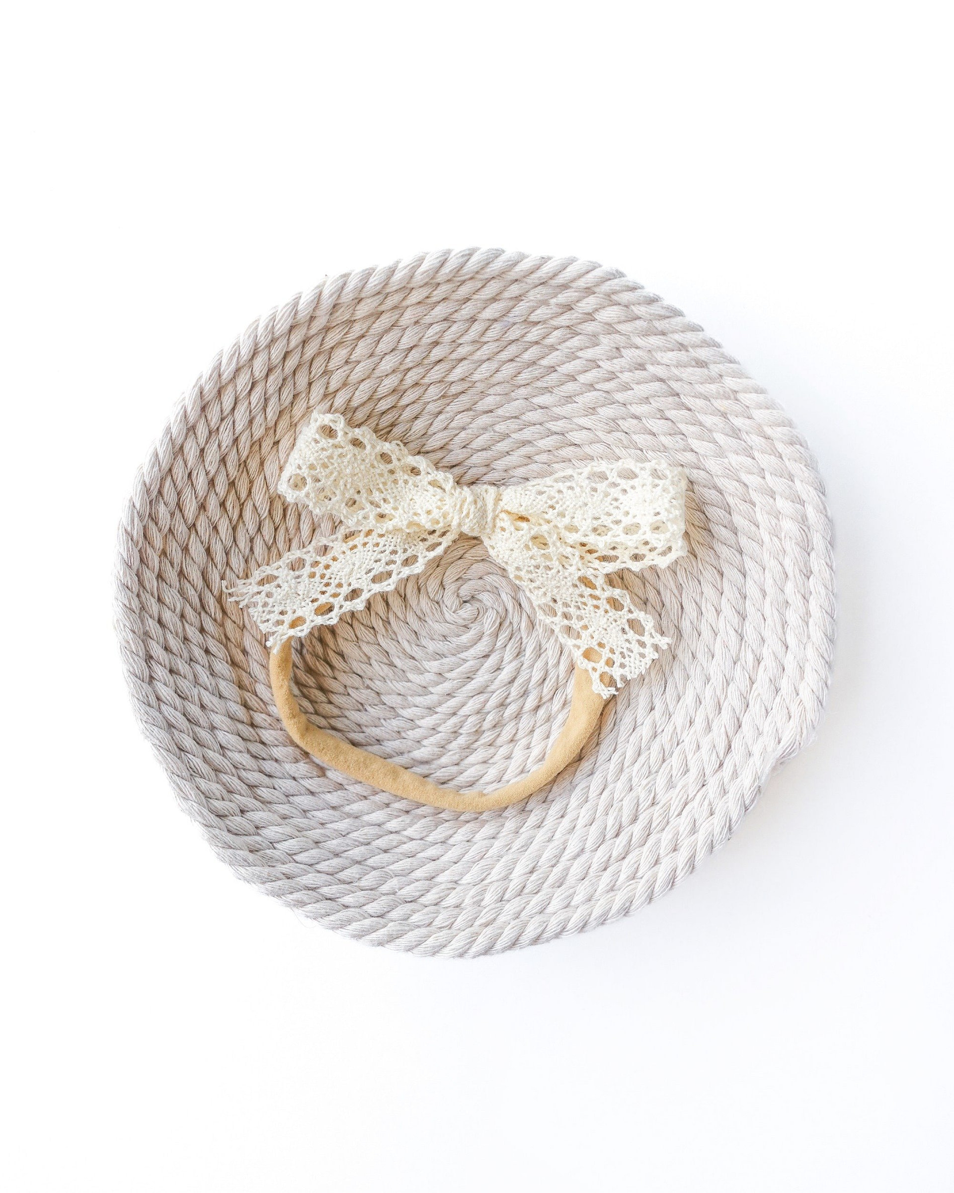 This handmade lace hair bow is crafted with care from delicate ivory lace, creating a timeless and elegant accessory for little girls.
