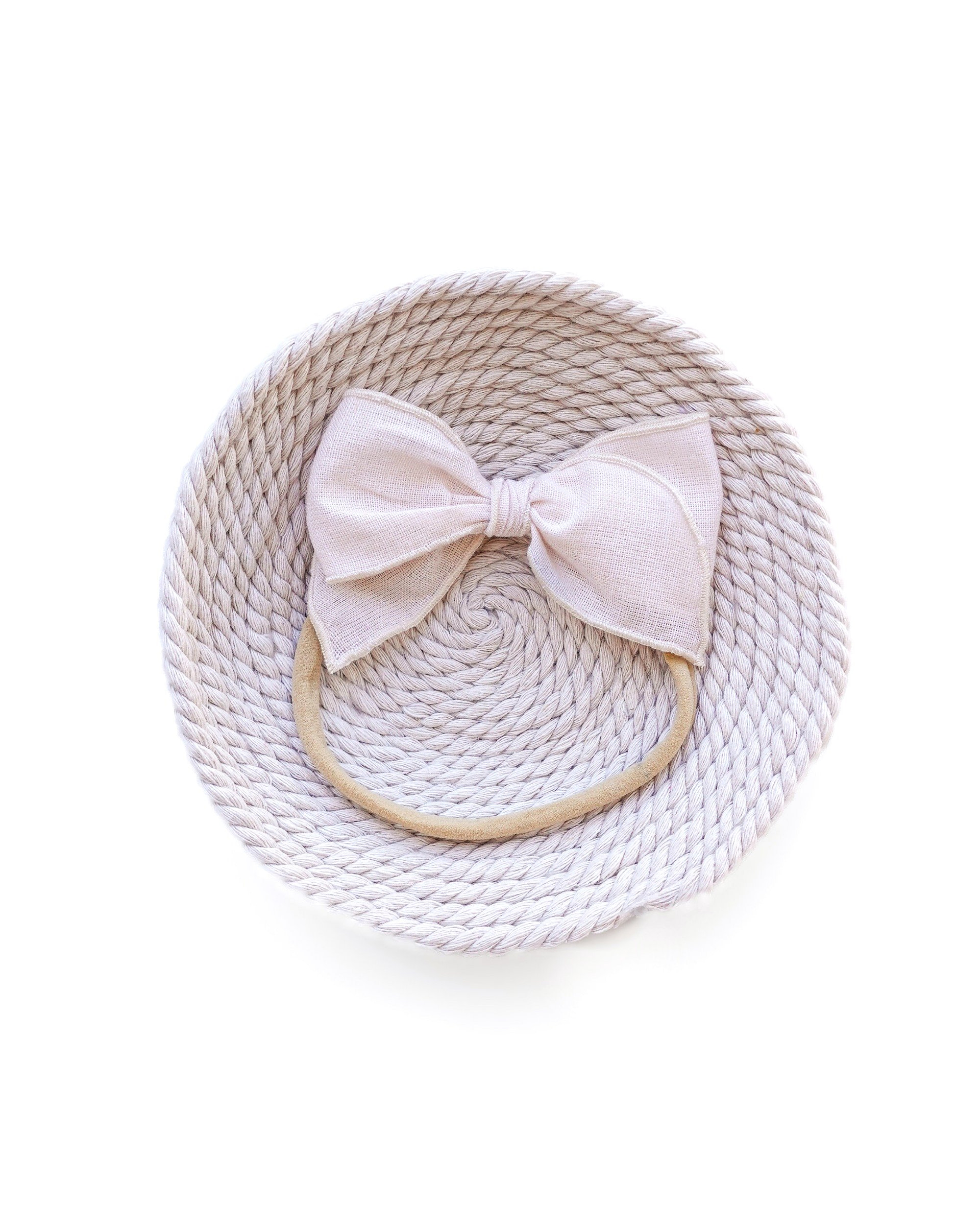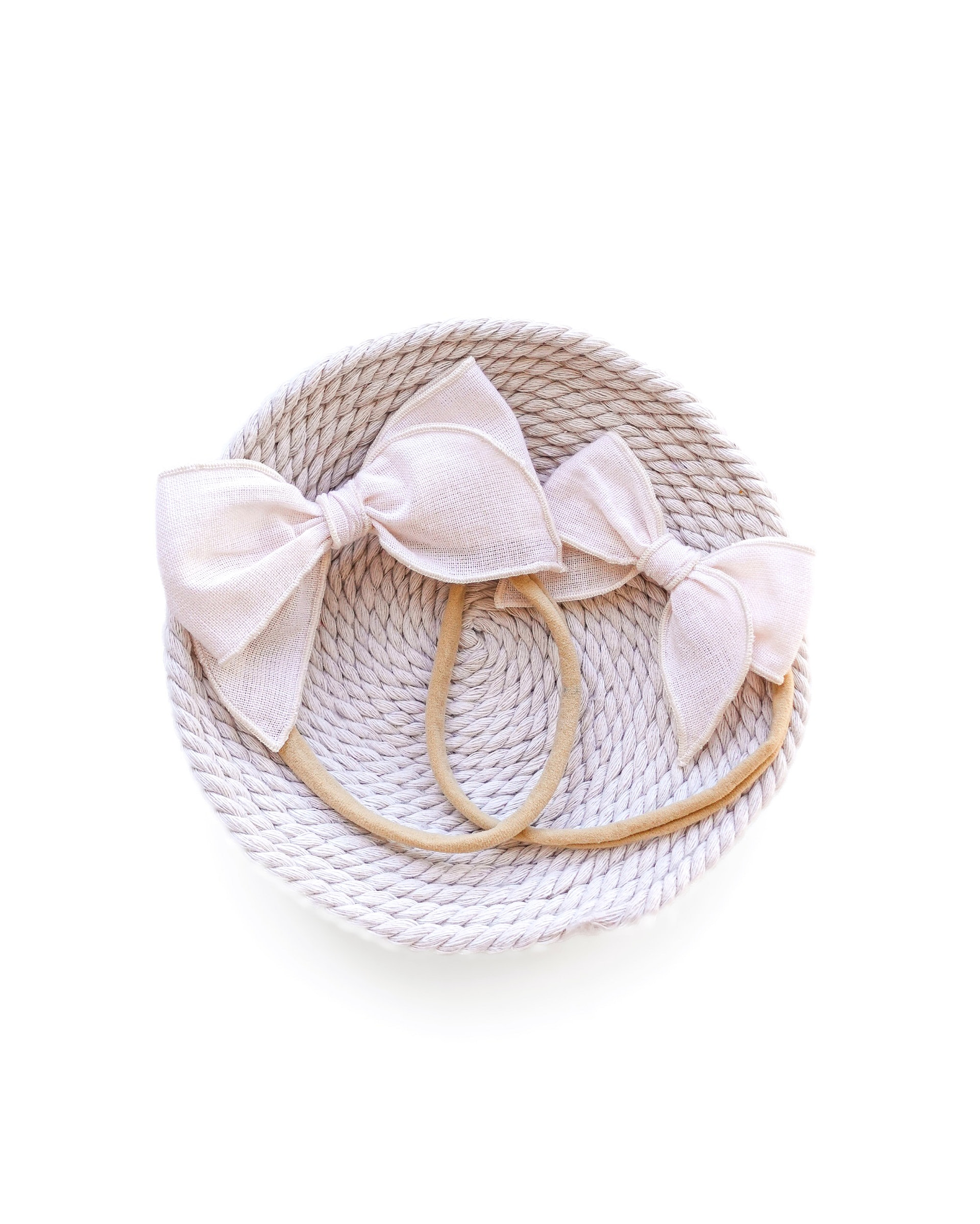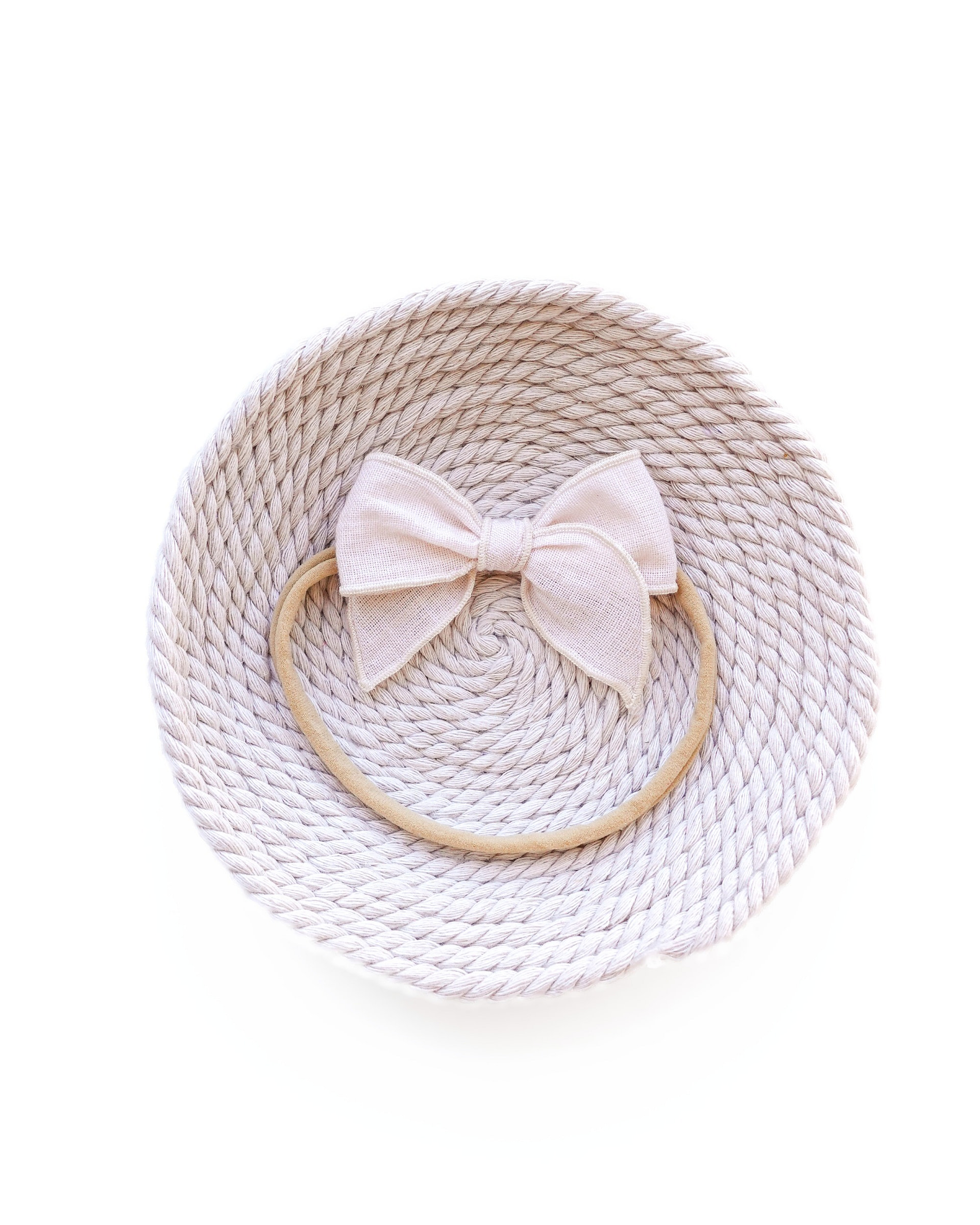 Handmade ivory linen bow with a soft minimalist design. Available as a nylon headband or hair clip.