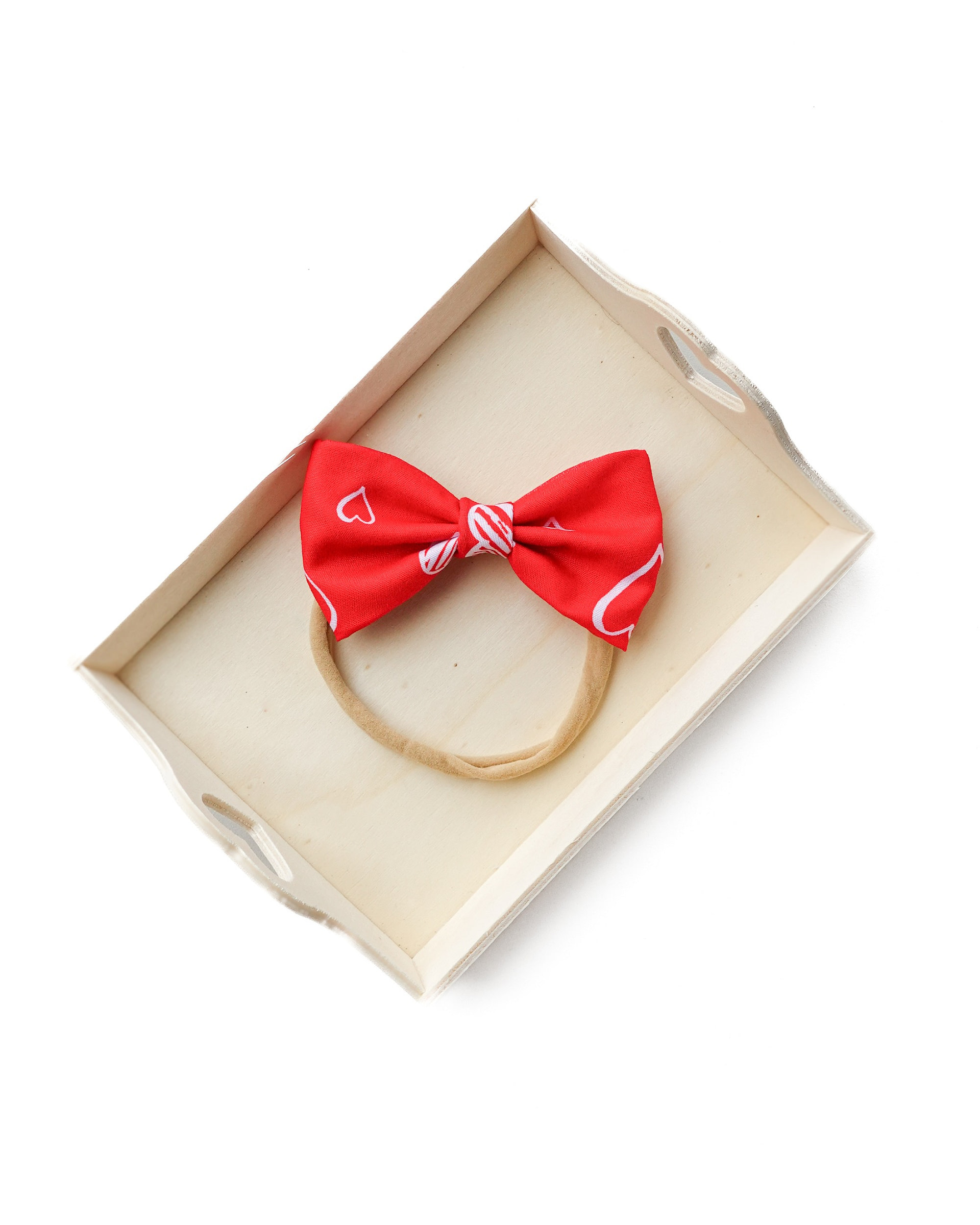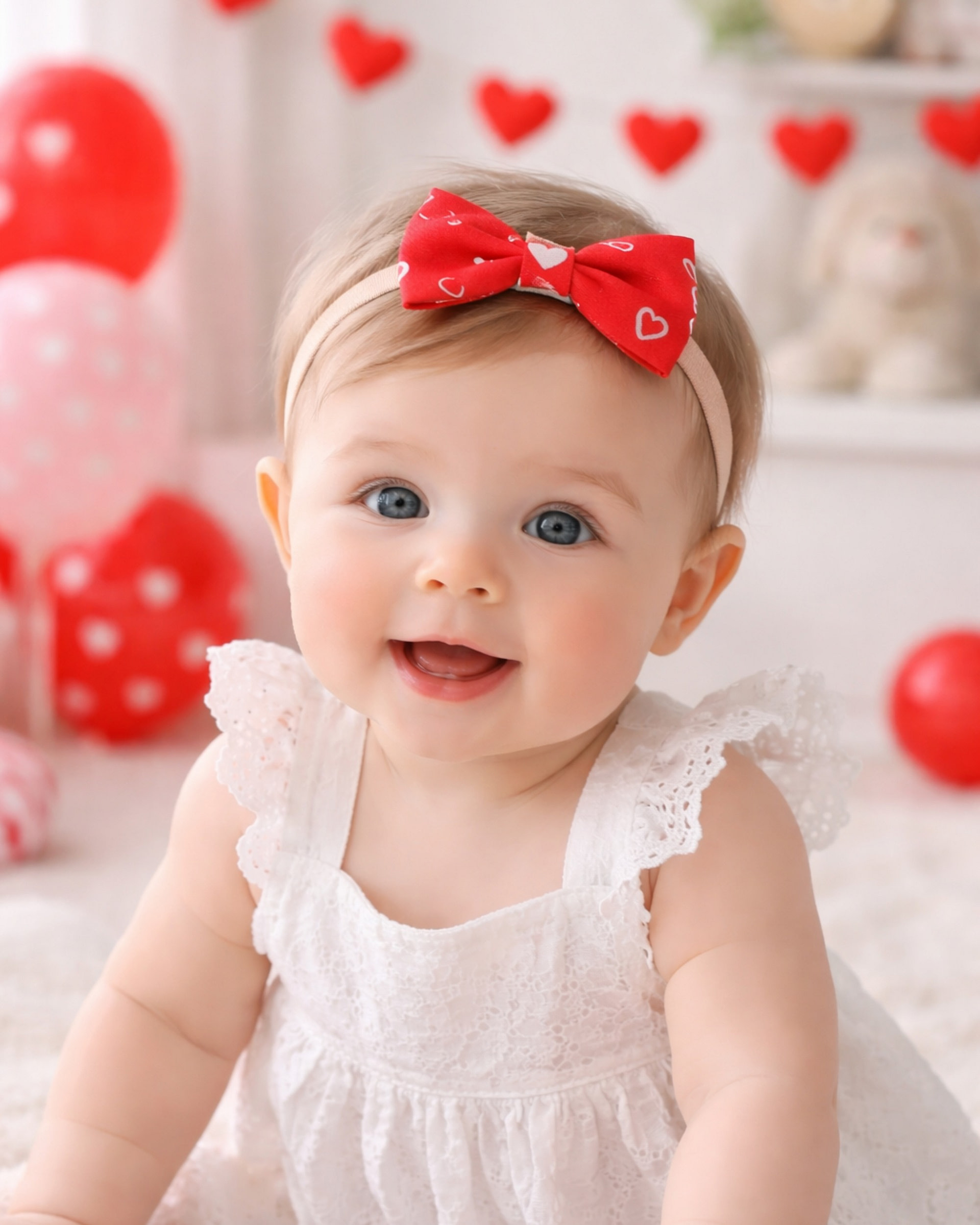A handmade red bow featuring a sweet white heart pattern, crafted from soft cotton fabric. This classic bow is lightweight, neatly shaped, and designed for comfortable everyday wear. Its timeless Valentine-inspired design makes it perfect for babies and toddlers, whether for photoshoots, festive outfits, or special moments. Thoughtfully made by Meow Bowtique with care, quality, and attention to detail.