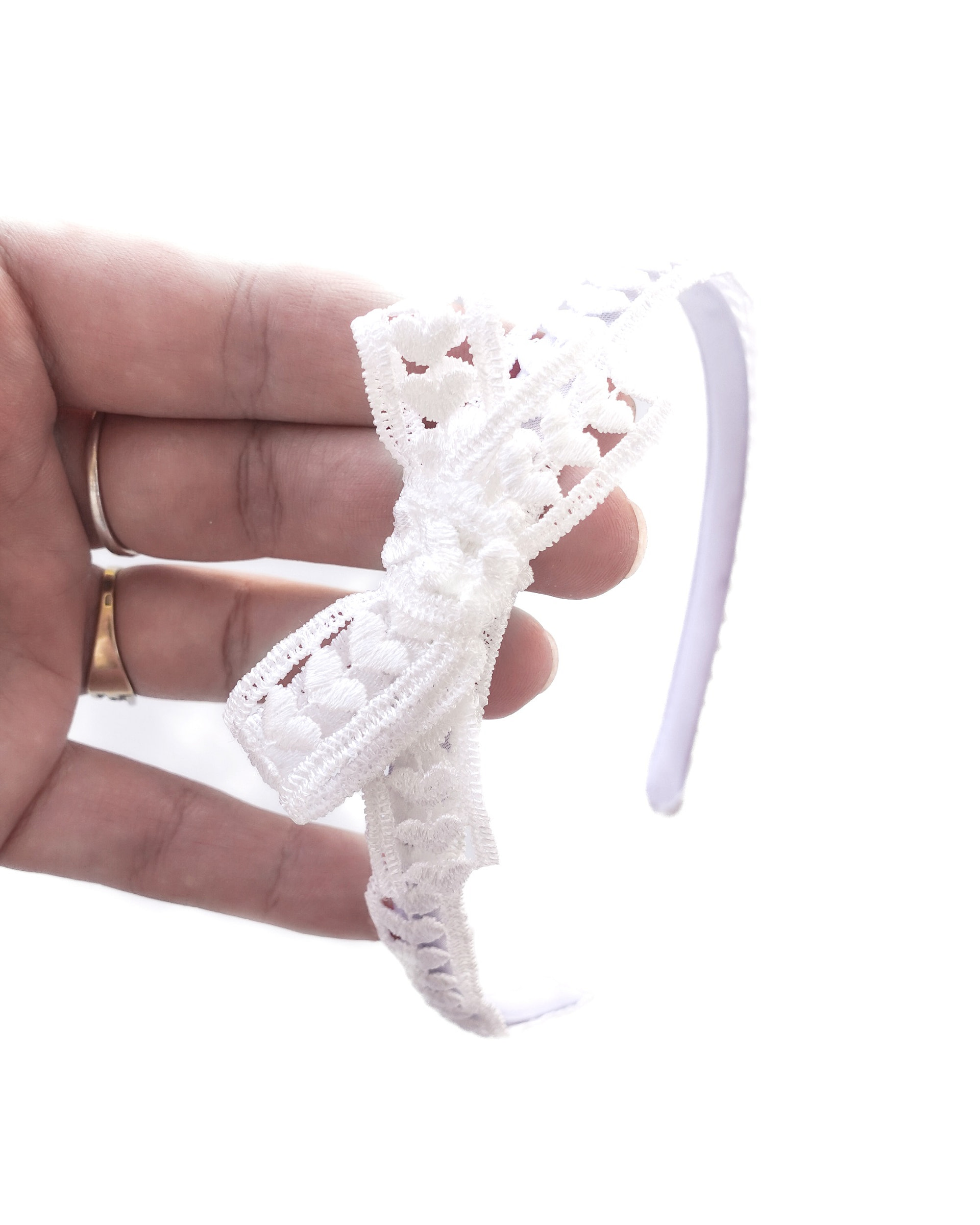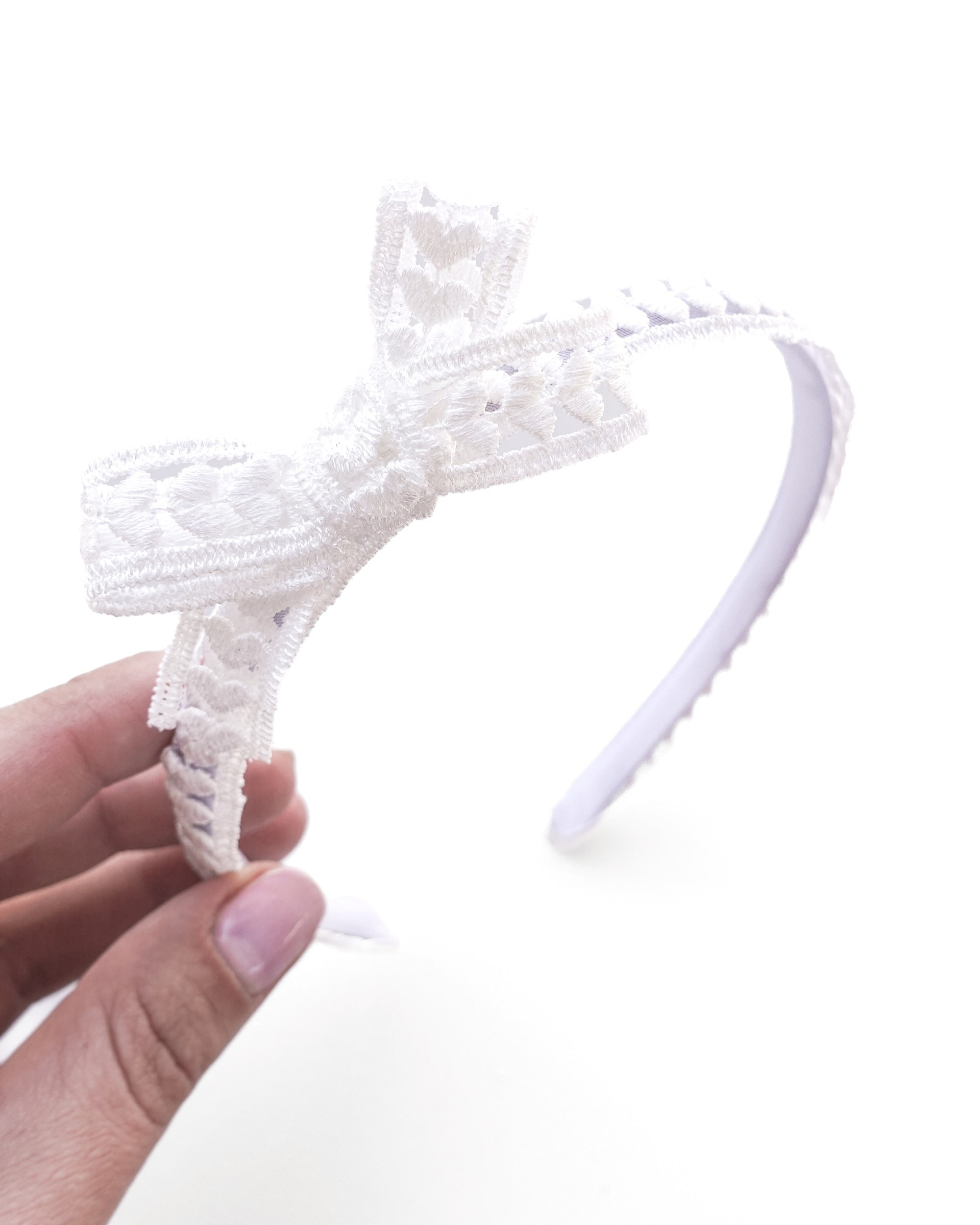 Handmade white lace baby headband with a delicate bow. Soft, elegant, and perfect for newborn photos, christenings, and special occasions.